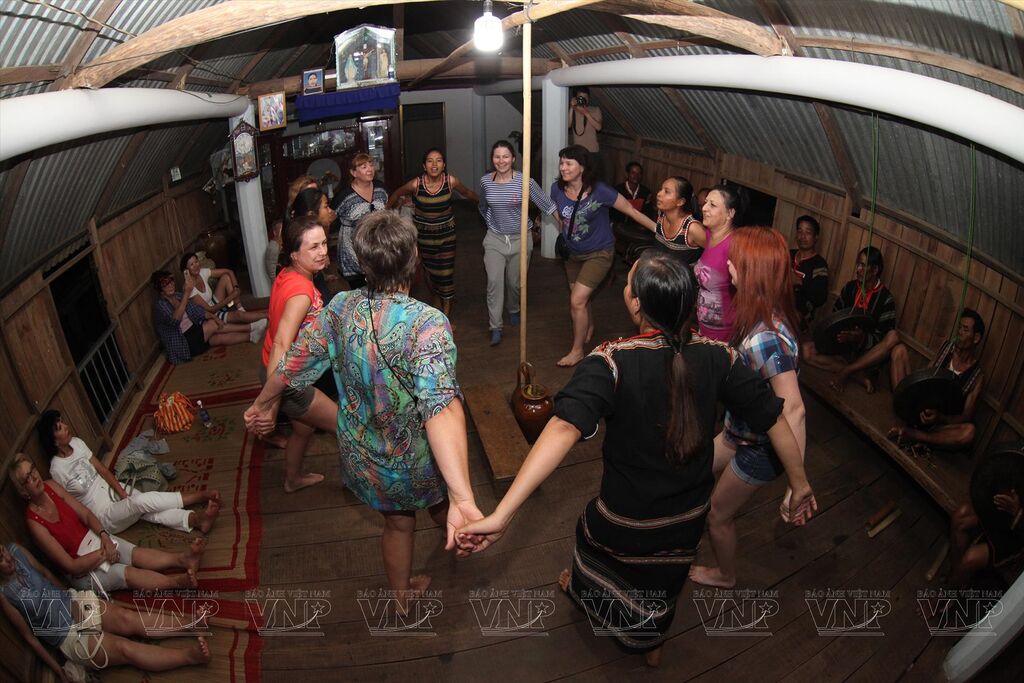| Touristes étrangers dansant aux sons des gongs dans une Nhà dài (maison longue sur pilotis) de l’ethnie M’Nông dans la province de Dak Lak.  |