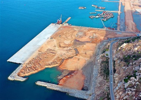 | Vue aérienne du port de Cà Na en chantier, province de Ninh Thuân (Centre). |