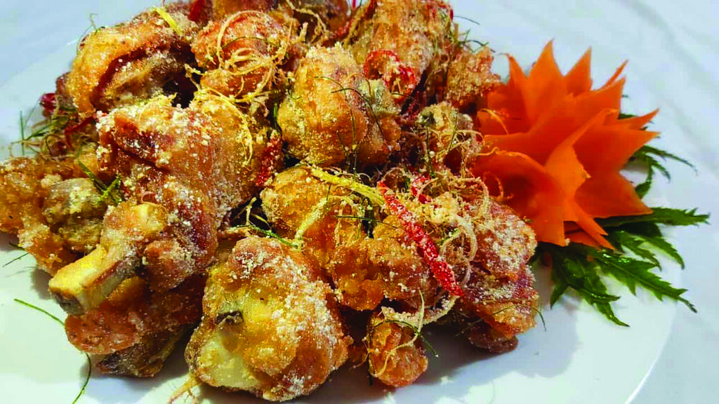 - Avant de frire le poulet, enrobez-le dans la marinade à l’aide de farine de tapioca. Toujours dans la même casserole, ajoutez le reste de l’huile et portez-la à ébullition. Ajoutez les morceaux de poulet et faites-les frire jusqu’à ce qu’ils soient uniformément dorés à l’extérieur et tendres à l’intérieur. Retirez-les de la casserole et placez-les dans un récipient. Versez ensuite le mélange de sel sur les morceaux de poulet encore chauds et mélangez bien.