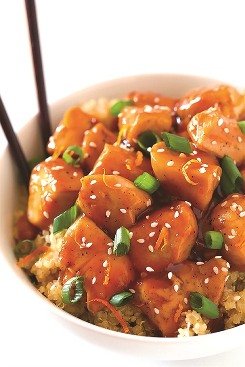 - Dans une poêle, faire chauffer la sauce à l’orange et la remuer pendant la cuisson. Une fois qu’elle est onctueuse, rajouter le poulet dans la poêle. Remuer doucement. Arroser les morceaux de poulet de sauce à l’orange, puis éteindre le feu.