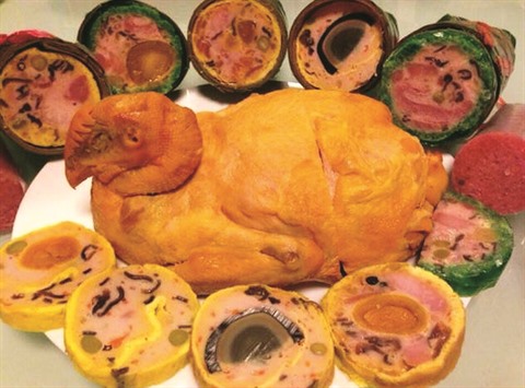 - Mélanger le gio sông, les tranches de peau de porc, de jambon et les œufs salés. Ajouter une cuillère à café de poivre, ½ cuillère à soupe de sel, 2 cuillères à café de sucre et 2 autres de nuoc mam. Farcir le poulet avec le mélange obtenu. Suturer le ventre.