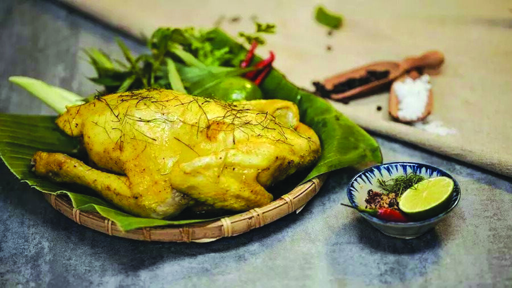 - Sortir et servir chaud avec le sel et le jus de citron vert ou kumquat. Couper le poulet bien cuit en morceaux à l’aide d’un grand couteau puis présenter dans une grande assiette.