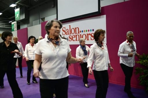 | Des femmes participent à une danse à l'ouverture du Salon des seniors à Paris, le 9 avril. |