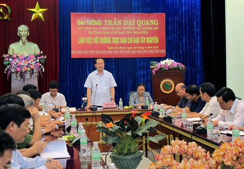| Le général Trân Dai Quang, ministre de la Police, chef du Comité de pilotage du Tây Nguyên (CPTN), a eu une séance de travail avec la permanence du CPTN, le 24 mai à Dak Lak |