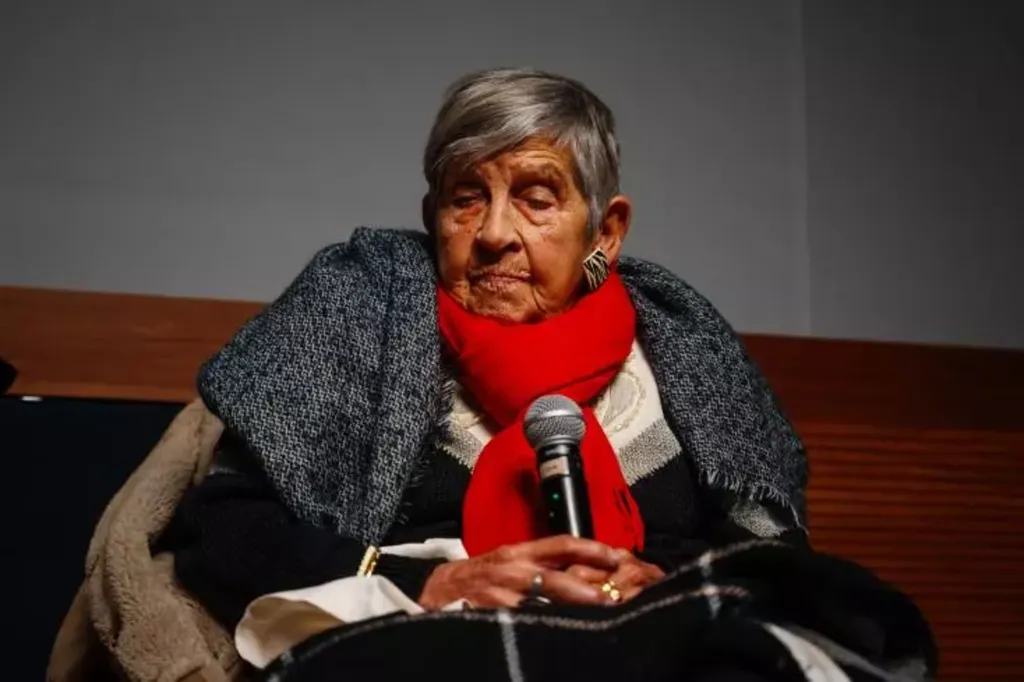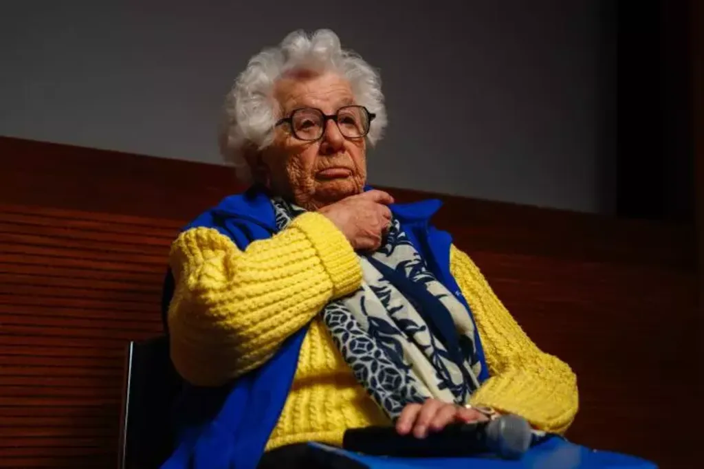 | Esther Sénot, survivante de l'Holocauste, lors d'une cérémonie marquant le 80e anniversaire de la libération des camps de concentration et d'extermination en Europe au Musée du Mémorial de la Shoah à Paris, le 19 janvier 2025. |