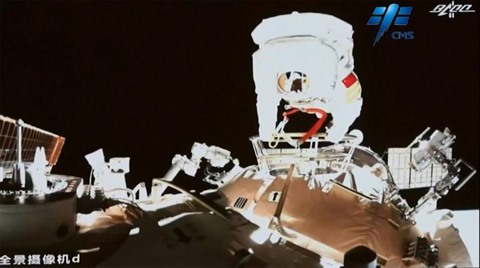 | Image tirée d'une vidéo fournie le 7 novembre par la Télévision chinoise CCTV de l'astronaute Wang Yaping lors d'une sortie dans l'espace depuis la station spatiale chinoise Tiangong. |