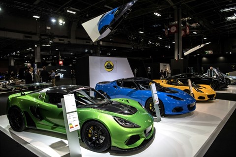 | Des voitures Lotus présentées au Mondial de l'automobile le 4 octobre à Paris. |