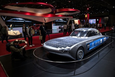 | Des visiteurs prennent en photo une voiture électrique solaire au Mondial de l'automobile à Paris le 4 octobre. |