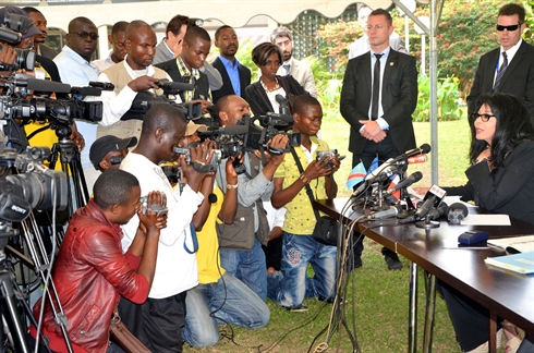 | La ministre française de la Francophonie, Yamina Benguigui (au micro), le 28 juillet à Kinshasa. Photo : AFP/VNA/CVN |