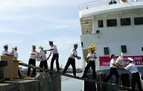 À l’approche du Têt, la mer est toujours agitée. Les bateaux doivent naviguer deux jours et deux nuits pour se rendre sur place. Si la houle n’est pas trop importante, les marchandises sont transférées des grands navires aux plates-formes via des canots. Le cas échéant, elles sont emballées dans des bâches en plastique et attachées à des cordes. Les soldats, équipés de leur gilet de sauvetage, nageront pour ramener tout ce paquetage au sec.