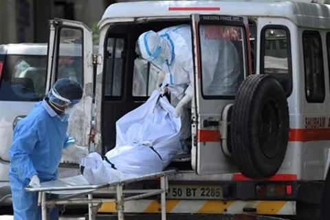 | Du personnel médical extrait un corps d'une ambulance à une morgue à New Dehli le 24 mai. |