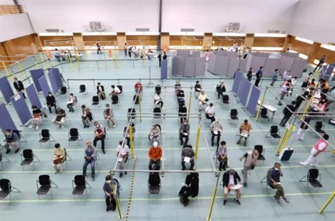 | Un centre de vaccination de masse contre le COVID-19, le 24 mai à Toyoake, au Japon. |