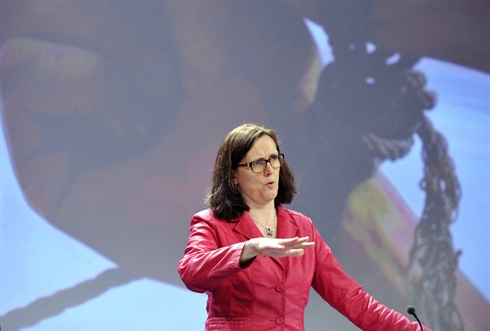 | La commissaire européenne chargée des Affaires intérieures, Cecilia Malmström, prend la parole le 15 avril à Bruxelles. |