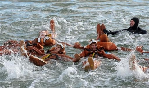 Après l'exercice hasardeux que constitue le fait de revêtir une combinaison de survie, assimilable à un lourd déguisement de "Casimir", pour qui n'en a pas l'habitude, le plongeon dans l'eau fraîche de février est parfois pour les stagiaires un moment redouté.
