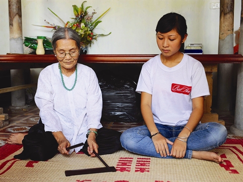 | L’«Atiste du Peuple» Nguyên Thi Chuc (gauche), domiciliée dans le district de Hoài Duc (en banlieue de Hanoi), transmet son savoir à sa petite-fille. |