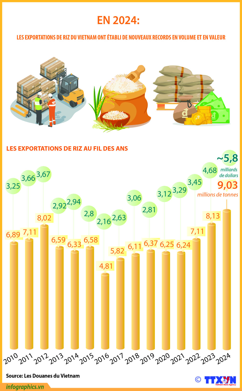 L'avenir du secteur du riz vietnamien dépend de sa capacité à innover et à s'adapter au marché international. Le soutien du gouvernement et la coopération entre les parties prenantes sont essentiels pour que l'industrie du riz se développe de manière durable. Grâce à des efforts incessants, le riz vietnamien continuera de s'imposer sur le marché mondial, en se connectant avec un nombre croissant de consommateurs sur les marchés internationaux et en affirmant sa position sur la carte des exportations mondiales de riz.