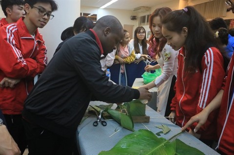 | Des étudiants étrangers apprennent à confectionner des banh chung. |