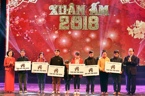 | Truong Thi Mai (1re à gauche) et Hoàng Trung Hai (1er à droite) remettent des maisons du cœur à des familles démunies |