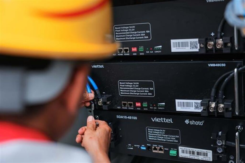 | Un ouvrier de la Société par actions de construction Viettel connectent et installent les équipements de la station BTS du réseau 5G |