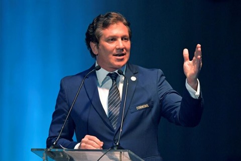 | Le président de la Confédération sud-américaine Alejandro Dominguez, s'exprimant devant le congrès de l'instance à Rio de Janeiro, le 10 avril. |