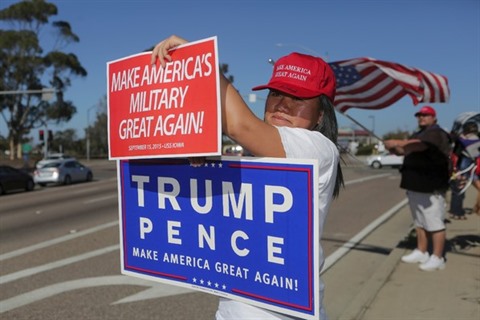 | Des partisans du président élu Donald Trump lors d'un rassemblement devant un camp militaire à Oceanside (Californie), le 11 novembre 2016. |