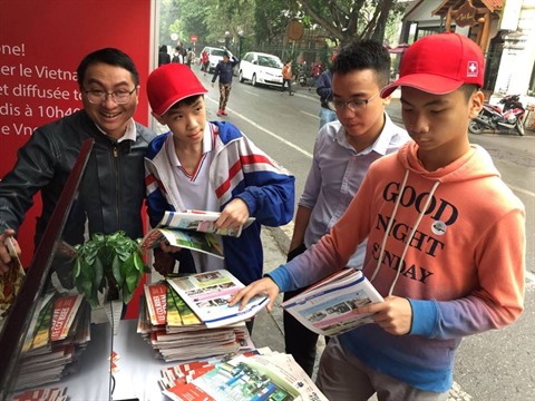 | Les jeunes visitent le stand du journal Le Courrier du Vietnam, dans le cadre de la fête "Couleurs francophones 2019", le 15 mars à Hanoï. |