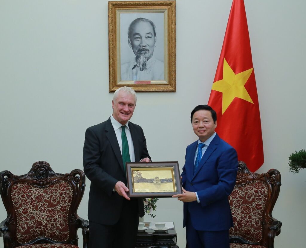 | Le vice-Premier ministre Trân Hông Hà (droite) reçoit le ministre britannique de la Sécurité énergétique et du Net zéro, Graham Stuart. |
