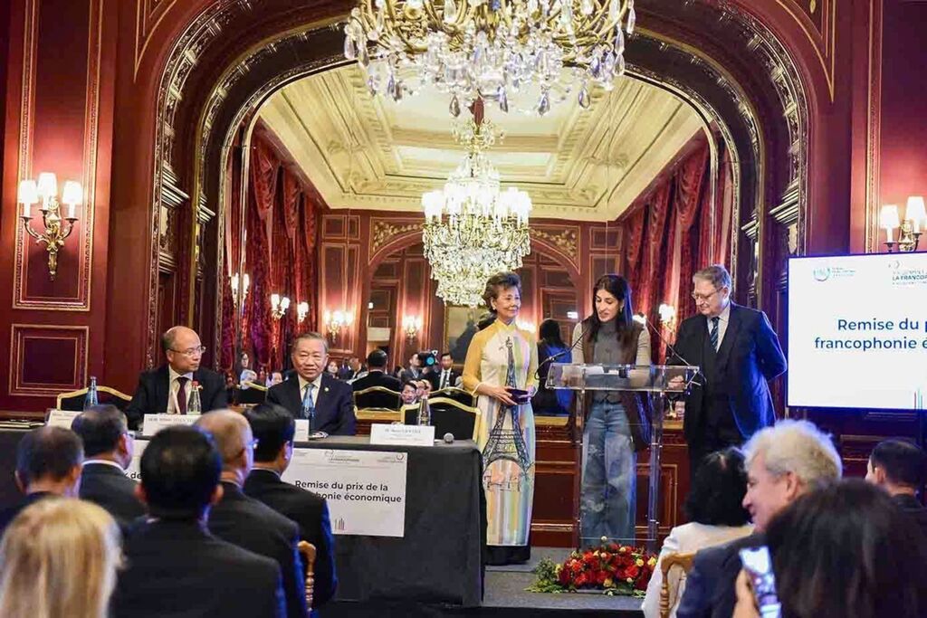 | Le dirigeant Tô Lâm (2e à gauche) assiste à la remise du prix de la francophonie économique au groupe vietnamien FPT, le 5 octobre à Paris. |