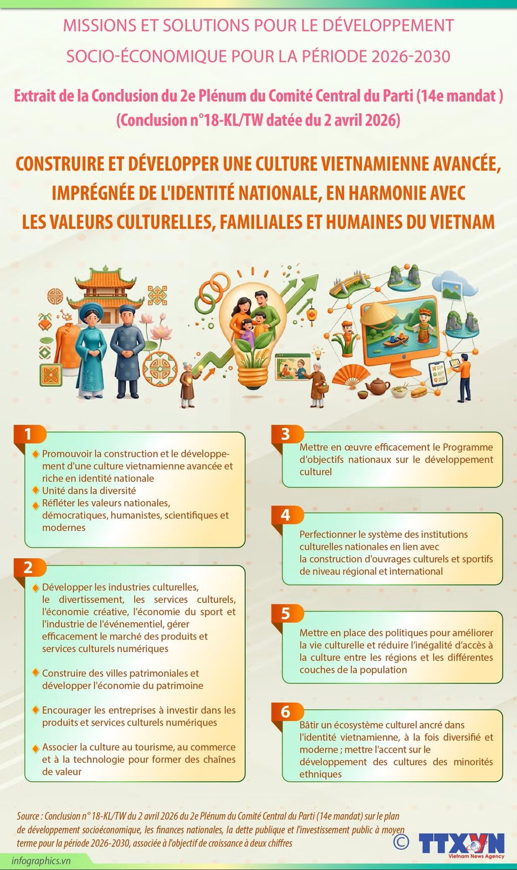 La Conclusion N°18-KL/TW du 2e plénum du Comité Central du Parti (XIVe mandat), datée du 2 avril 2026, appelle à construire et développer une culture vietnamienne avancée, imprégnée de l'identité nationale, en harmonie avec les valeurs culturelles, familiales et humaines du Vietnam.
