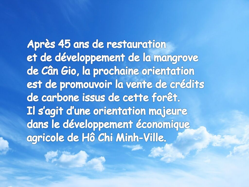 Récemment, Ðinh Minh Hiêp, directeur du Service de l’agriculture et du développement rural de Hô Chi Minh-Ville, a indiqué : “Nous avons travaillé avec le Service des ressources naturelles et de l’environnement et le Service des finances pour élaborer et perfectionner la politique de vente des crédits de carbone forestier de Cân Gio, afin de contribuer à l’augmentation de sa valeur”.
