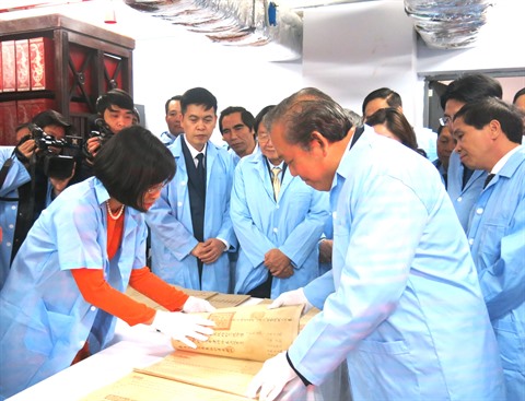 | Le vice-Premier ministre Truong Hoà Binh (1er à droite) visite l’entrepôt de "châu ban" de la dynastie des Nguyên au Centre des archives nationales N°1, le 23 février à Hanoï. |