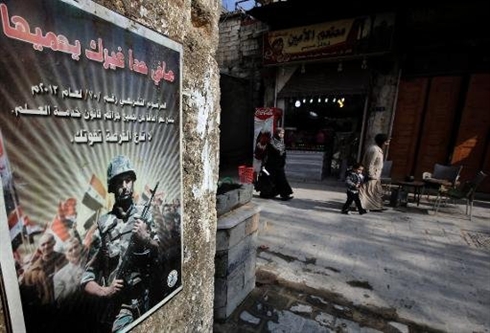 | Une affiche pro armée syrienne dans une rue de Damas, le 16 janvier. |