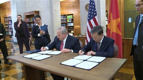 | Tô Lâm (droite) et Davis Bernhardt signent un accord de coopération, le 24 avril à Washington. |