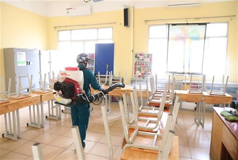 | Désinfection de classes du lycée Viêt Duc dans l'arrondissement de Hoàn Kiêm, Hanoï, le 2 février. |