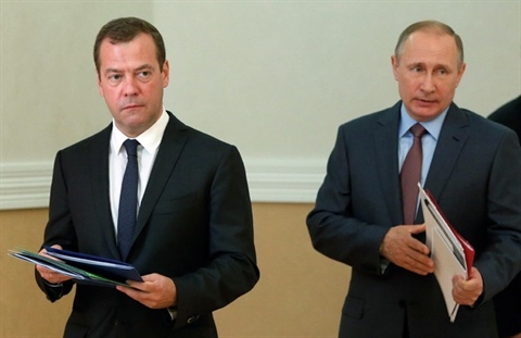 | Le président russe Vladimir Poutine (droite) et son Premier ministre Dmitri Medvedev lors d'une réunion à Sébastopol, en Crimée, le 19 août 2016. |