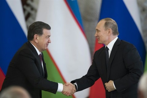 | Le président russe Vladimir Poutine (gauche) et son homologue ouzbek Chavkat Mirzioïev, à Moscou le 5 avril 2017. |