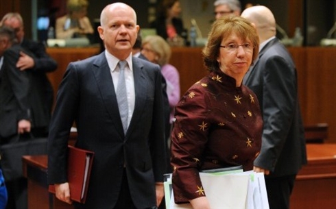 | Le ministre britannique des Affaires étrangères William Hague et la chef de la diplomatie européenne Catherine Ashton, le 17 mars à Bruxelles. |