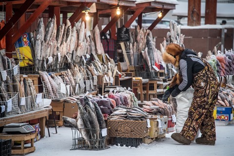 | Dans un marché de poissons dans la ville d'Yakoutsk de Sibérie centrale, en Russie, le 26 novembre 2018. |