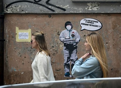 | Deux femmes passent devant un message mural où il est écrit : "Il y a une épidémie d'ignorance dans l'air, nous devons nous protéger", par l'artiste Laika, près du quartier chinois de Rome, le 4 février. |