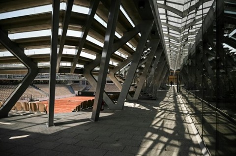 | Le nouveau court Simonne-Mathieu construit au fond du jardin des serres d'Auteuil, à Roland-Garros à Paris, le 21 mars 2019. |