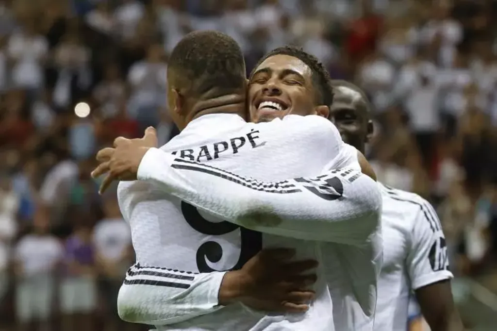| L'Anglais Jude Bellingham (droite) félicite l'attaquant français Kylian Mbappe à Varsovie en Supercoupe d'Europe contre l'Atalanta, le 14 août. |