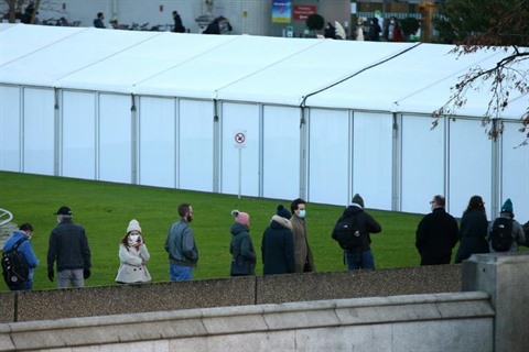 | Des personnes attendent pour se faire vacciner contre le COVID-19 devant l'hôpital St Thomas, le 10 décembre à Londres. |