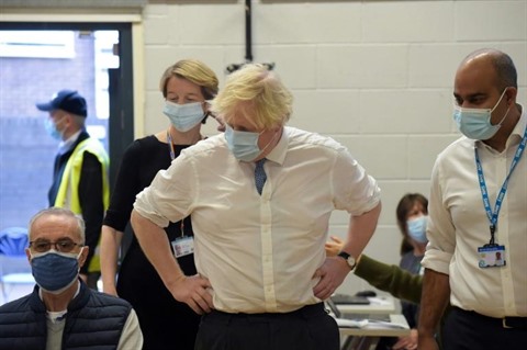 | Le Premier ministre britannique Boris Johnson visite un centre de vaccination contre le COVID-19, le 13 décembre à Londres. |