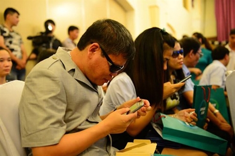 | Des invités essaient Speak Sim lors de la conférence de presse de Viettel pour présenter ce pack mobile réservé aux malvoyants. |