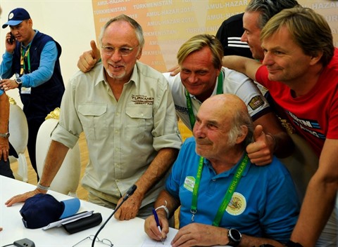 | Jean-Louis Schlesser (centre), ancien pilote et directeur du "Turkmen Desert Race", 1er rallye-raid organisé au Turkménistan lors d'un briefing, le 11 septembre à Amul. |