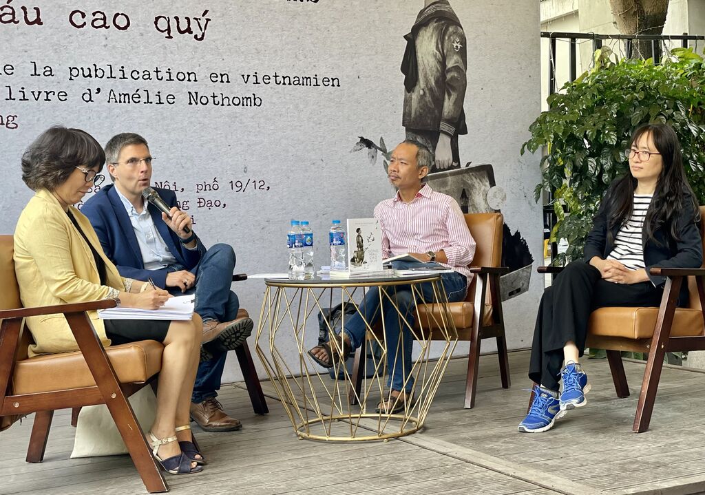 | Les intervenants présents au lancement de la version en vietnamien du 30e roman de l’écrivaine belge francophone Amélie Nothomb intitulé "Premier sang". |