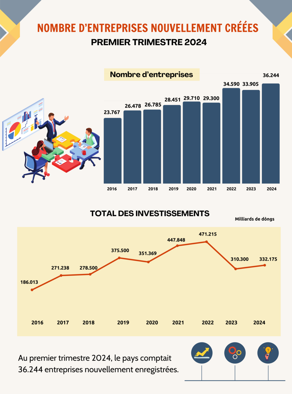 Les données sur l’enregistrement des entreprises au premier trimestre 2024 continuent de montrer que les difficultés ne se sont pas encore dissipées dans le monde des affaires, malgré l’augmentation du nombre d’entreprises enregistrées. De janvier à mars, la situation des entreprises a montré des signes d’amélioration par rapport à la même période de 2023. Cependant, les défis du monde des affaires persistent. Les fonds totaux injectés dans l’économie au cours du premier trimestre se sont élevés à 724.507 milliards de dôngs, en baisse de 4,3% par rapport à la même période de 2023, constituant ainsi le niveau le plus bas de la période 2019-2024.