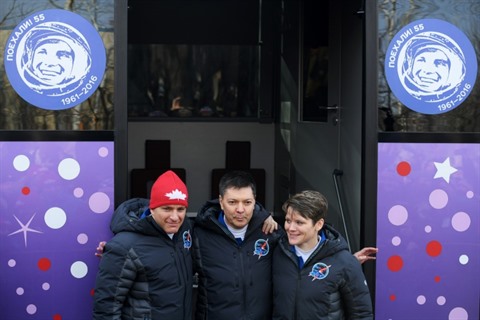 | Oleg Kononenko (centre), Anne McClain (droite) et David Saint-Jacques, les trois membres de l'ISS, avant le décollage de leur fusée, à Baïkonour. |