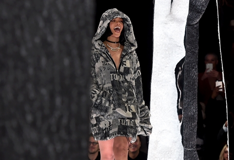 En fin de défilé, marqué notamment par la présence du mannequin vedette Gigi Hadid, Rihanna est venue saluer brièvement, vêtue d'un manteau aux manches immenses, qui semblait lui servir également de robe.