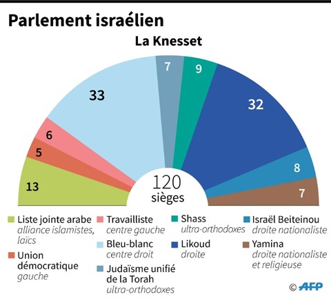 Benjamin Netanyahu, plus pérenne des Premiers ministres de l'histoire d'Israël, est soutenu par un "bloc" de 54 élus formé avec ses alliés de l'ultra-droite et de partis juifs ultra-orthodoxes.